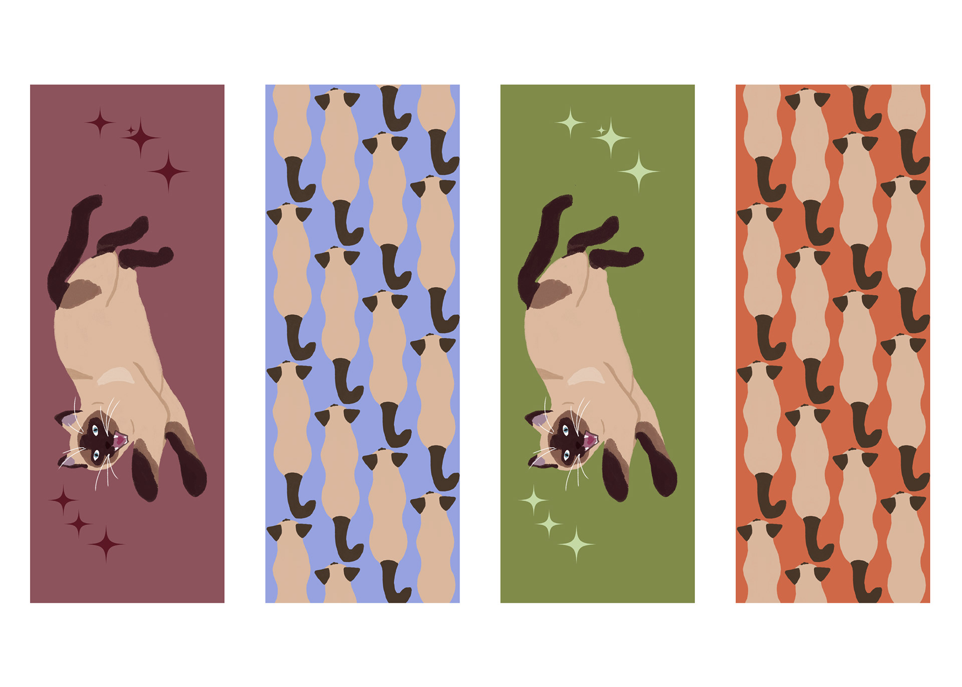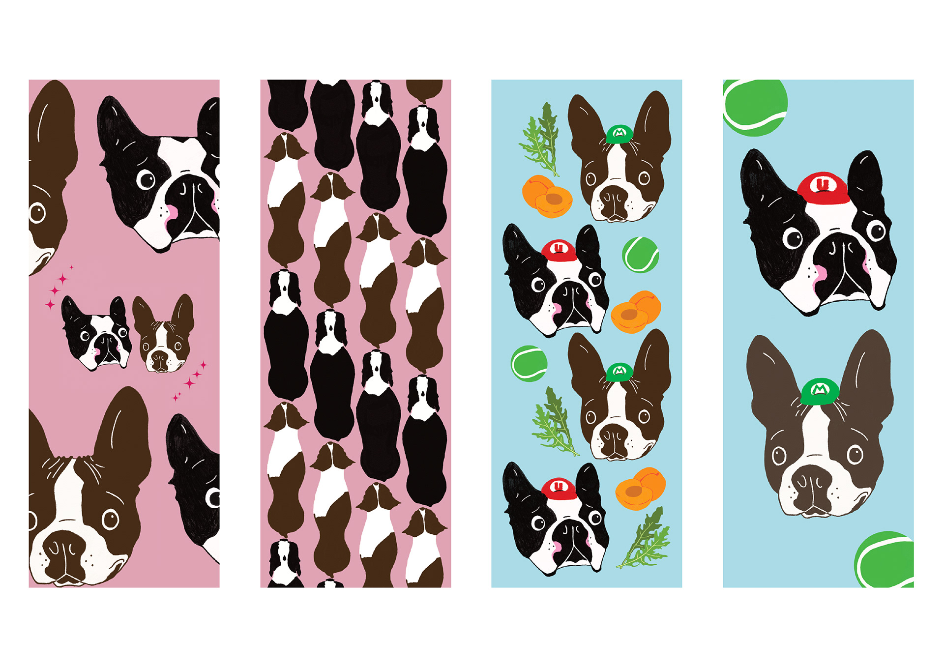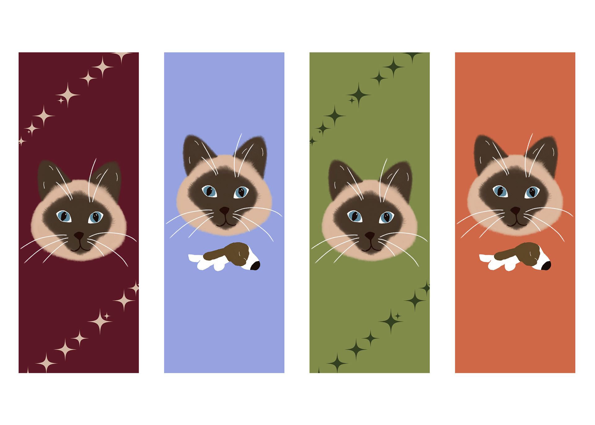 I illustrated dog and cat themed bookmarks based on sweet fur babies I know as a Christmas gift for my friends. The illustrations depict these pets with their favorite toys and snacks.